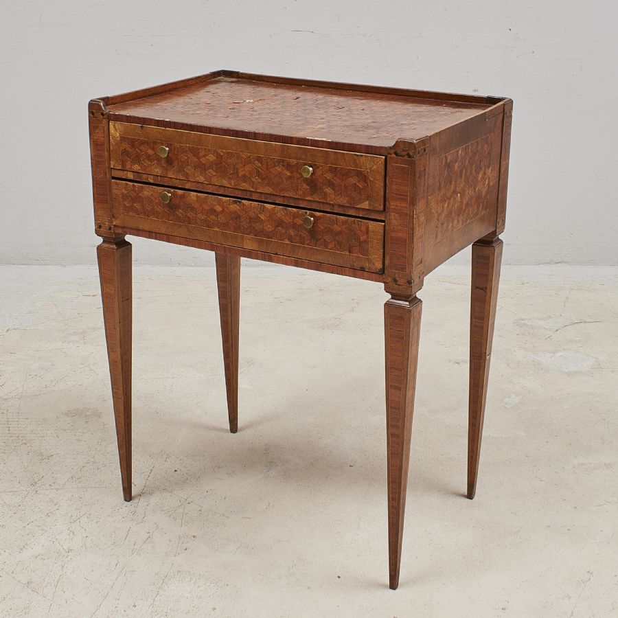 inlaid woodwork, två lådor i sarg, beslag av mässing. Length: 65 cm. Width: 43 cm, height: 82 cm, damages, wear, intarsiabitar saknas.