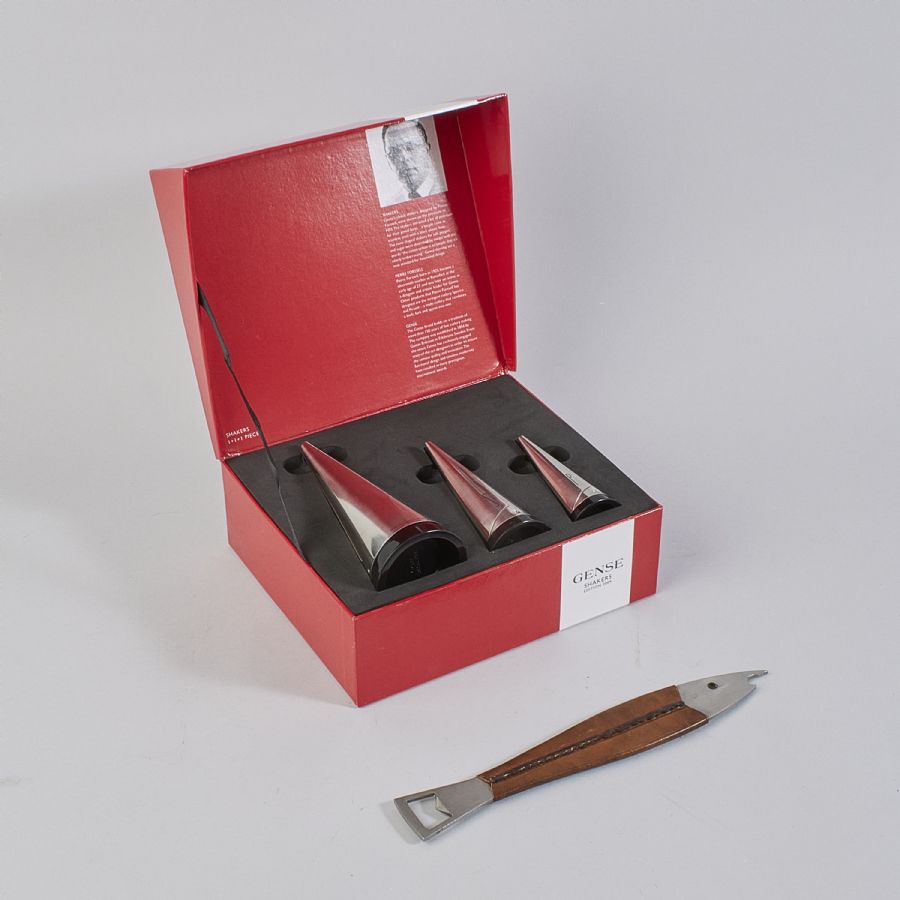 Ströare, 3 delar + kapsylöppnare med läder i form av en fisk, Gense, "The Shakers", rostrfitt stål. Höjd: 9-16 cm