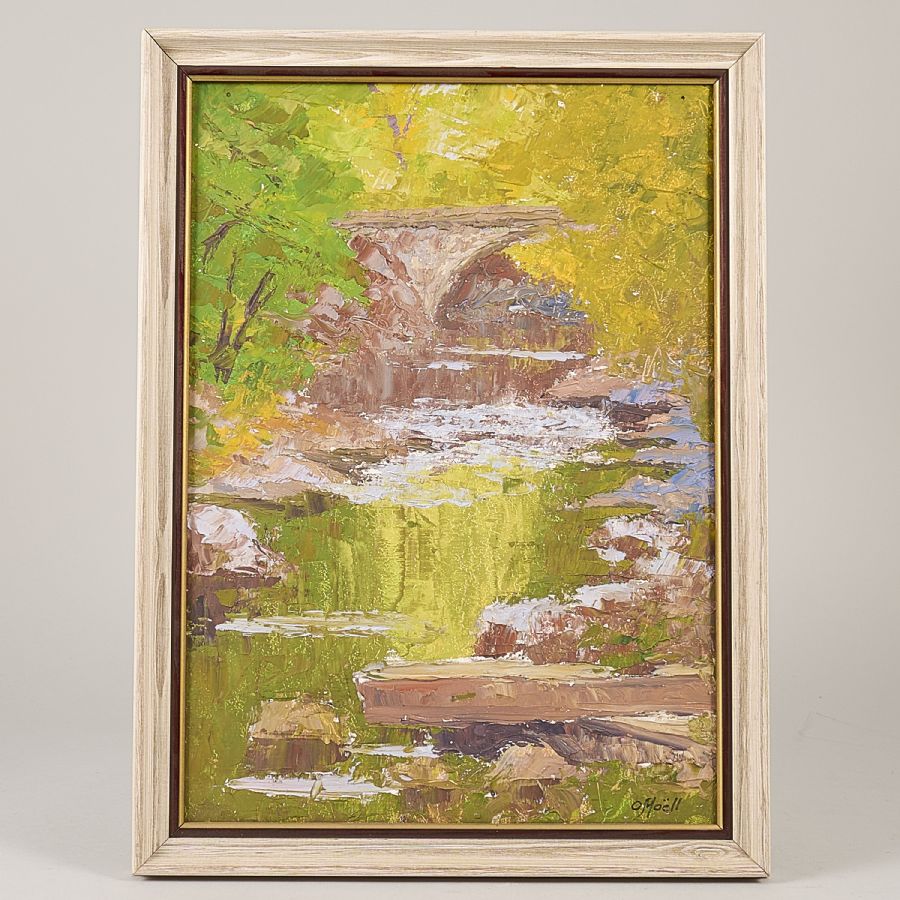 Oidentifierad konstnär. Signerad O Moell, bäck med bro. Olja på pannå, 42x30 cm, yttermått inklusive ram: 47x35 cm