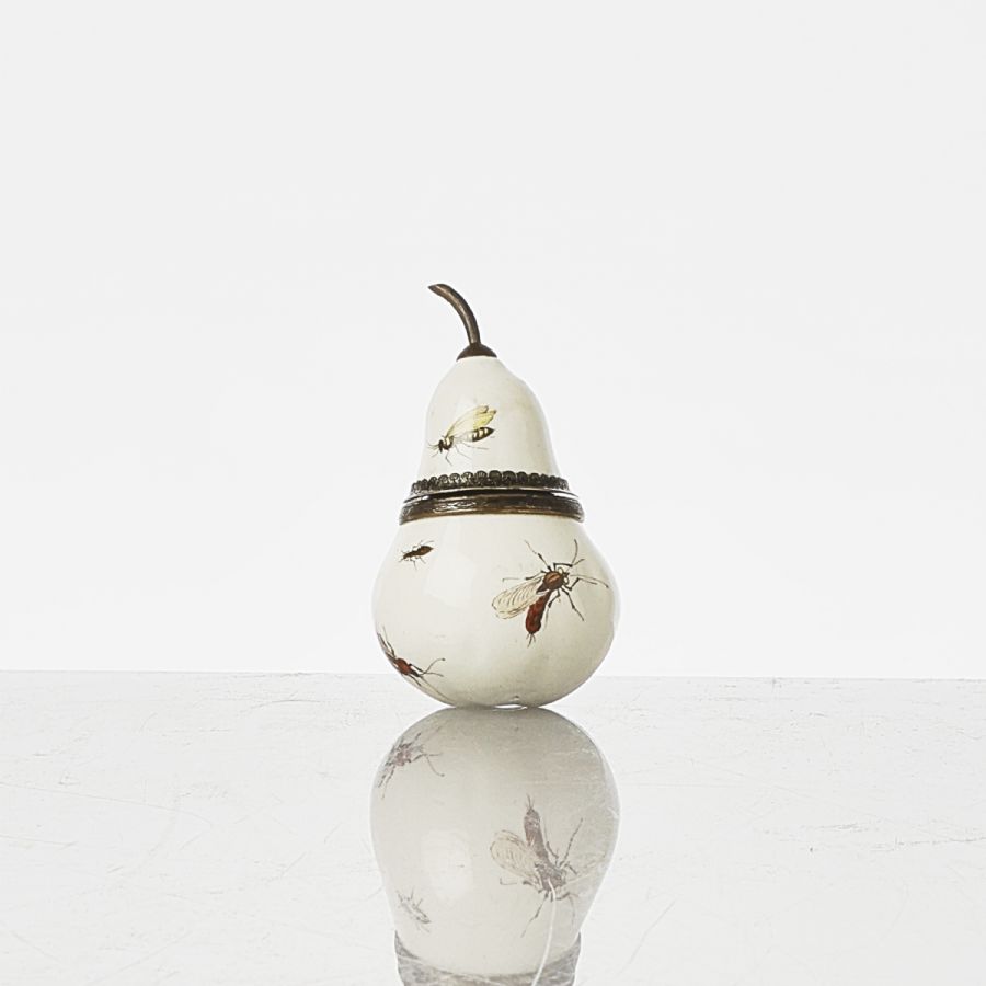 Porslin, förgylld metall, handmålad, I form av päron. Höjd: 9,5 cm