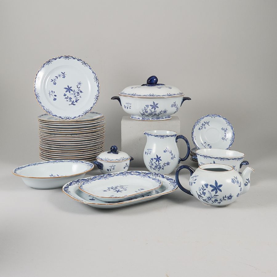 37 delar Rörstrand, Ostindia, blå dekor på ljusblå botten, porcelain, 11 mattallrikar, 12 djupa tallrikar, 6 kaffefat, 3 uppläggningsfat/skål, sauceboat, jug, tureen, sugar bowl, tekanna (ej lock). Diameter: 12-24 cm. Length: 23, 5-32 cm, mikronagg.
