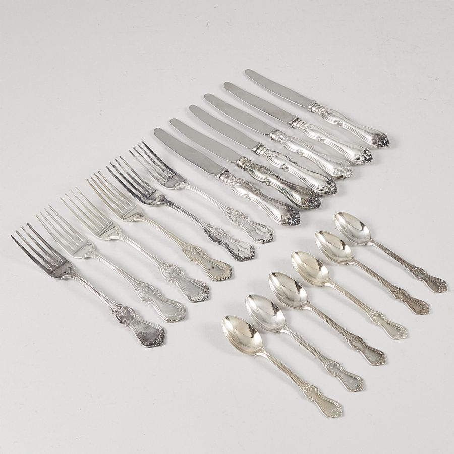 silver, 18 delar, modell Olga, Längd: 12,5-21. Vikt: 840 gr Brutto, varav knivar 485 gr