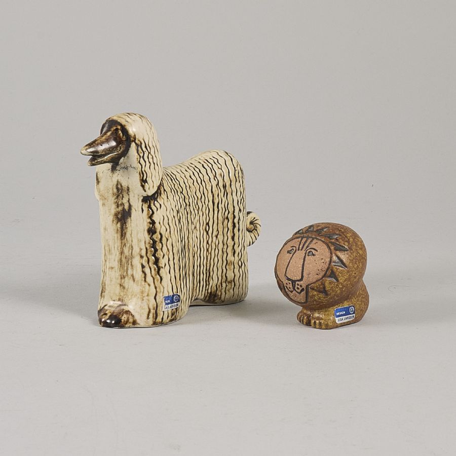 Skulpturer, 2 st, Hund & Lejon, etiketterade, Gustavsberg. Höjd: 5-11 cm