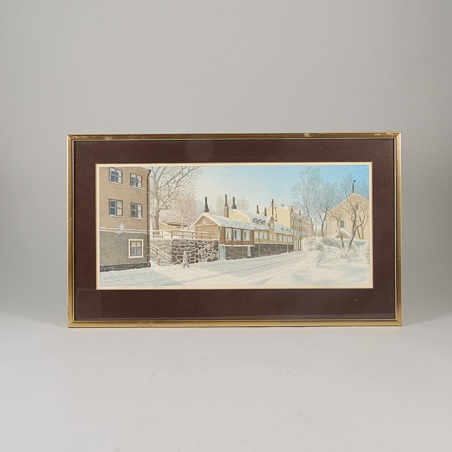 "Fjällgatan". Signerad, numrerad 180/360. Färglitografi, bildmått: 25x56 cm, yttermått inklusive ram: 40x70 cm