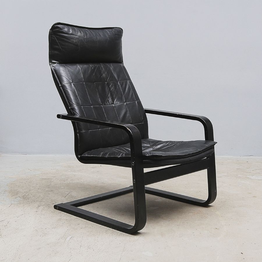 IKEA, 1990-tal, "Kimsta", sits och rygg i skinn, skiktlimmad stomme i svärtat trä, Höjd 93 cm, sitthöjd 40 cm. Bredd: 60 cm