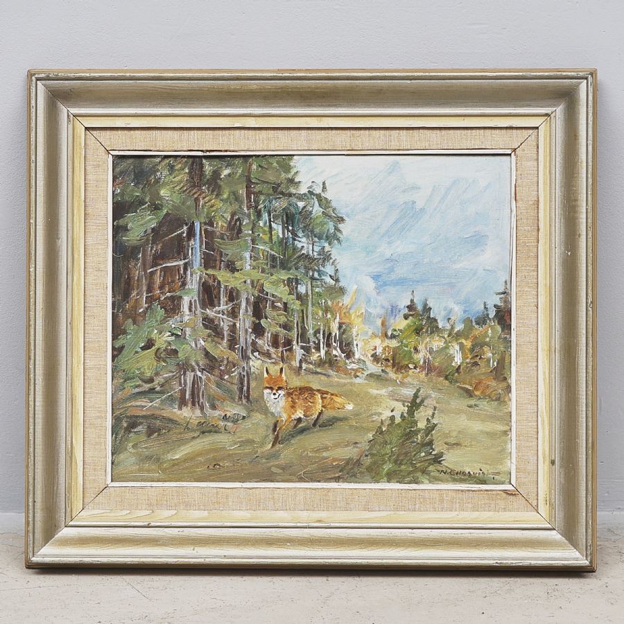 Nils Engquist (1905-1991), Sverige. Signerad, Räv i skogslandskap. Olja på duk, 47x56 cm, yttermått inklusive ram: 69x78 cm