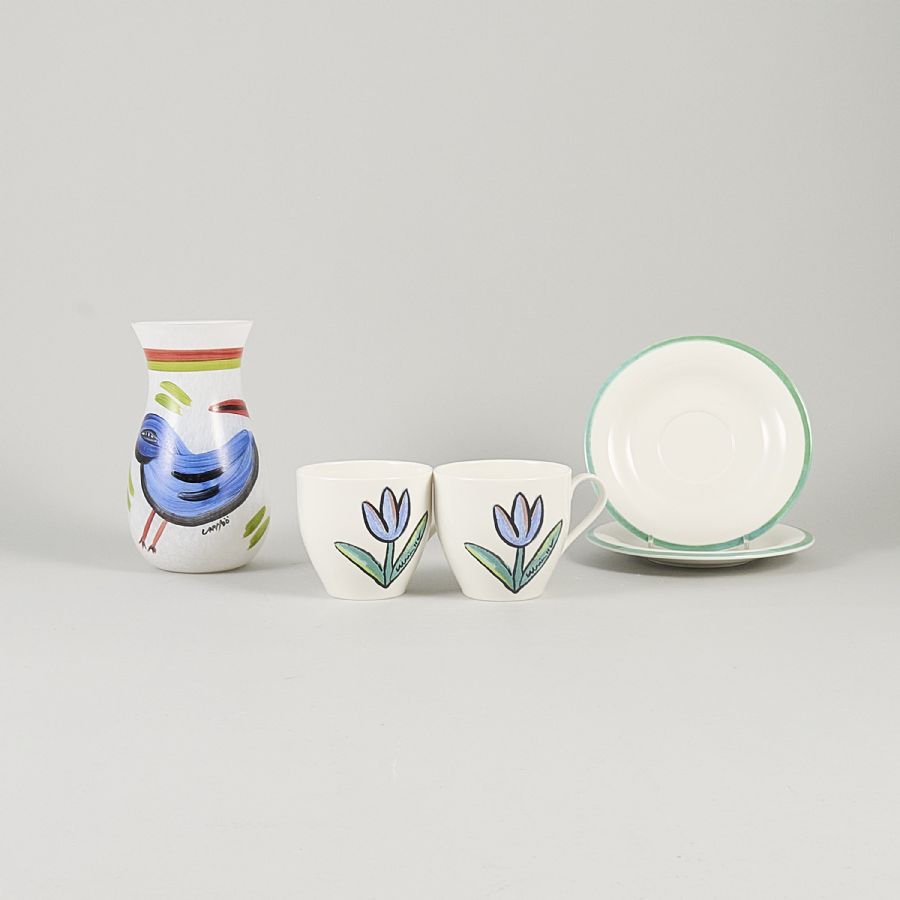 Koppar med fat, 2 del + vas, Ulrica Hydman-Vallien (1938-2018), Sverige, 2 koppar porslin, glasvas