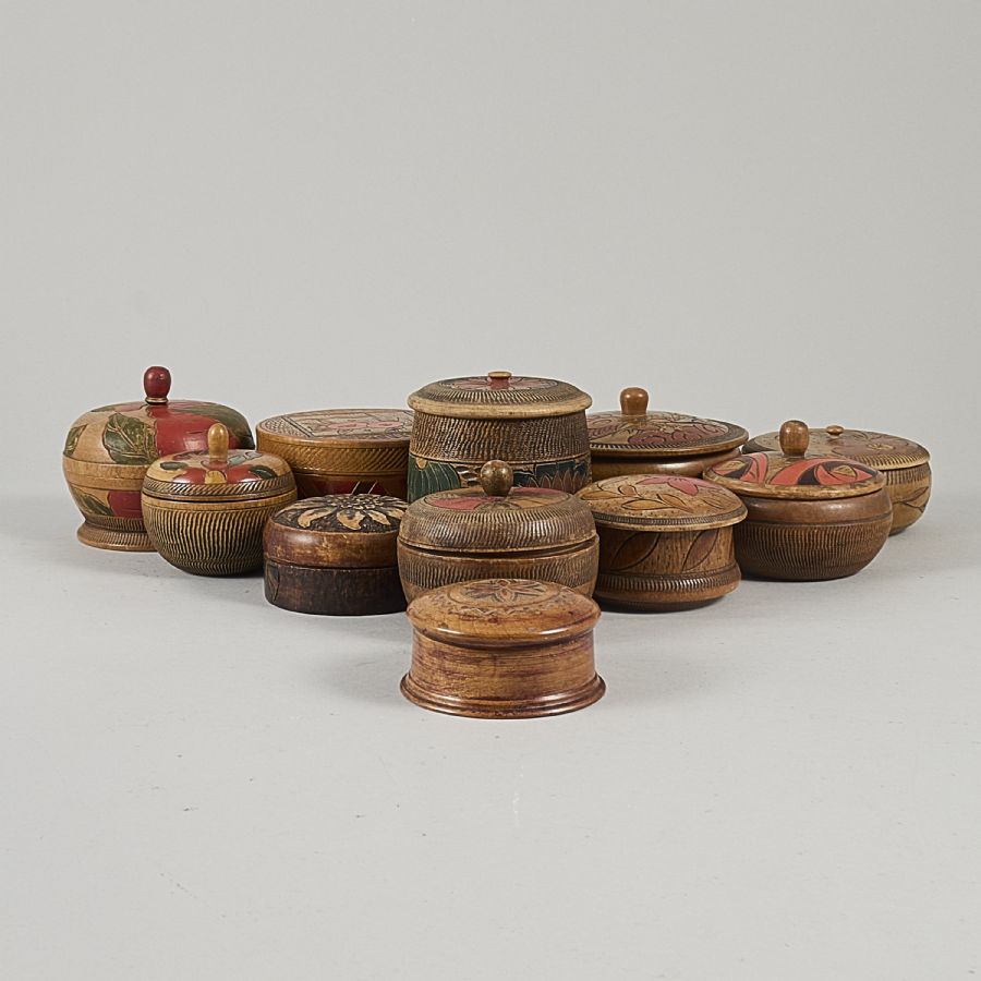 11 st, Japan, trä med reliefdekor, motiv av blomma och drake, 1930-50-tal. Diameter: 8-13cm, ca. Höjd: 4-11 cm ca