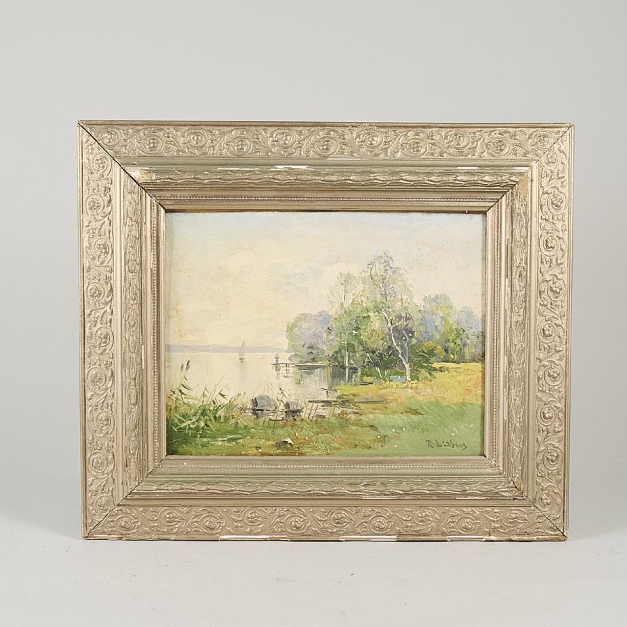 R Lidberg, kust. Signerad. Olja på pannå, 24x30 cm, yttermått inklusive ram: 40x47