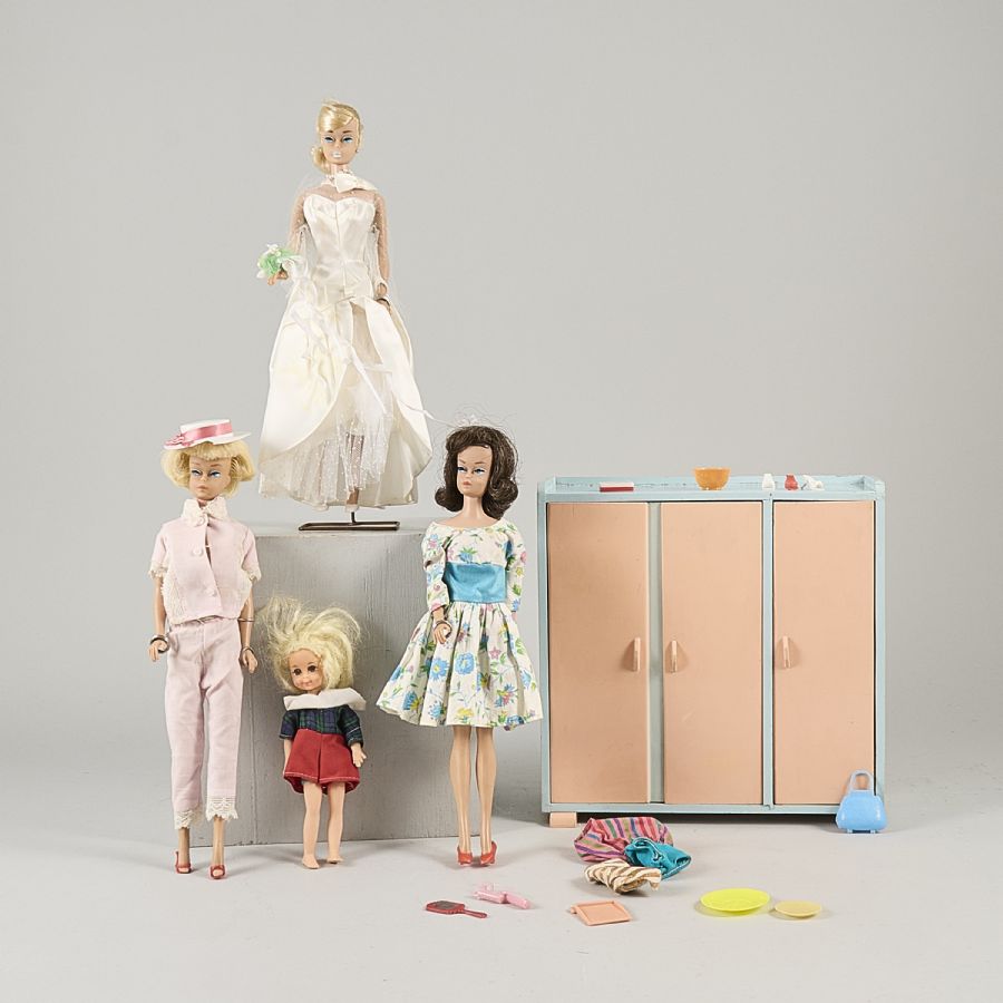 4 st Mattel + klädskåp och kläder, barbiebrud och barbie i blommig klänning stämplade Midge ©1962 Barbie ©1958, barbie i rosa kläder stämplad ©1958, barn stämplad ©1965, ställning och originalask medföljer. Längd: 16-30 cm