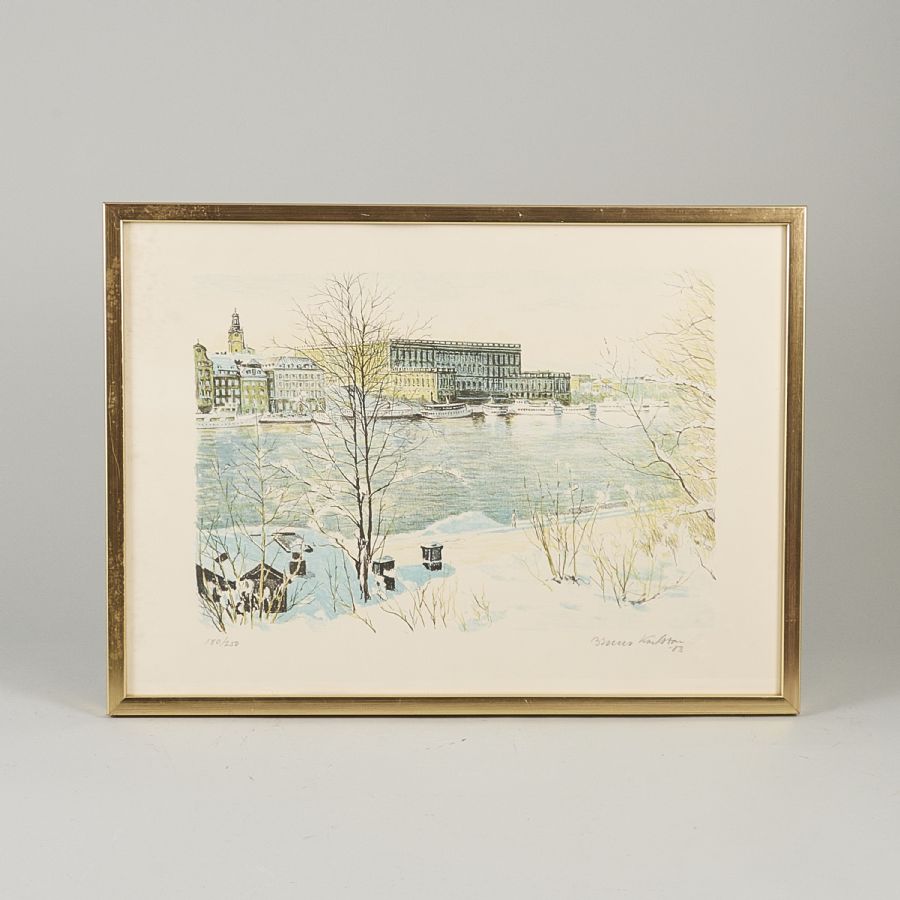Signerad, numrerad 180/250, daterad -83, "Vinter över Stockholms ström". Färglitografi, bildmått: 30x43 cm, yttermått inklusive ram: 41x57 cm