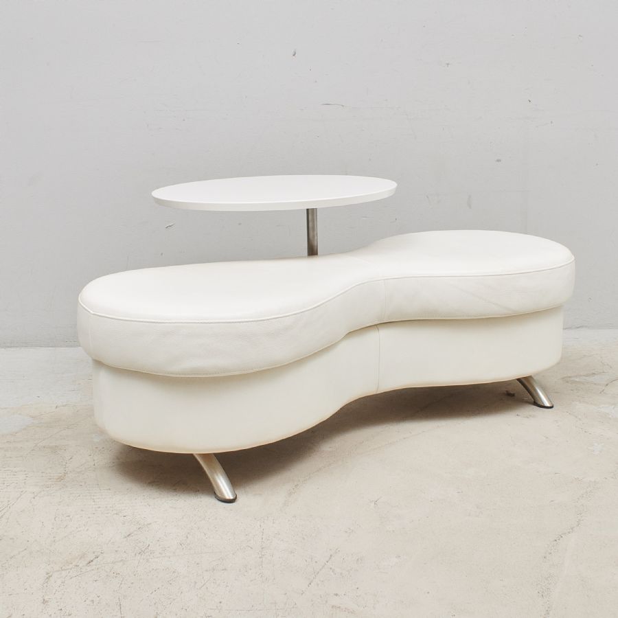 med snurrbart bord, Arild Alnes och Helge Taraldsen, Brunstad, Norge, "Stream", kromade medar, vitt skinn. Bredd: 142 cm. Djup: 42 cm. Höjd: 52 cm