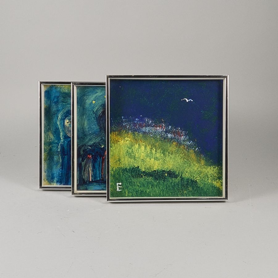 Akrylmålning, 3 st, Monogramsignerad, varav en signerad A Tergo, blå betraktelser, yttermått inklusive ram: 28x34,31x30,29x32 cm