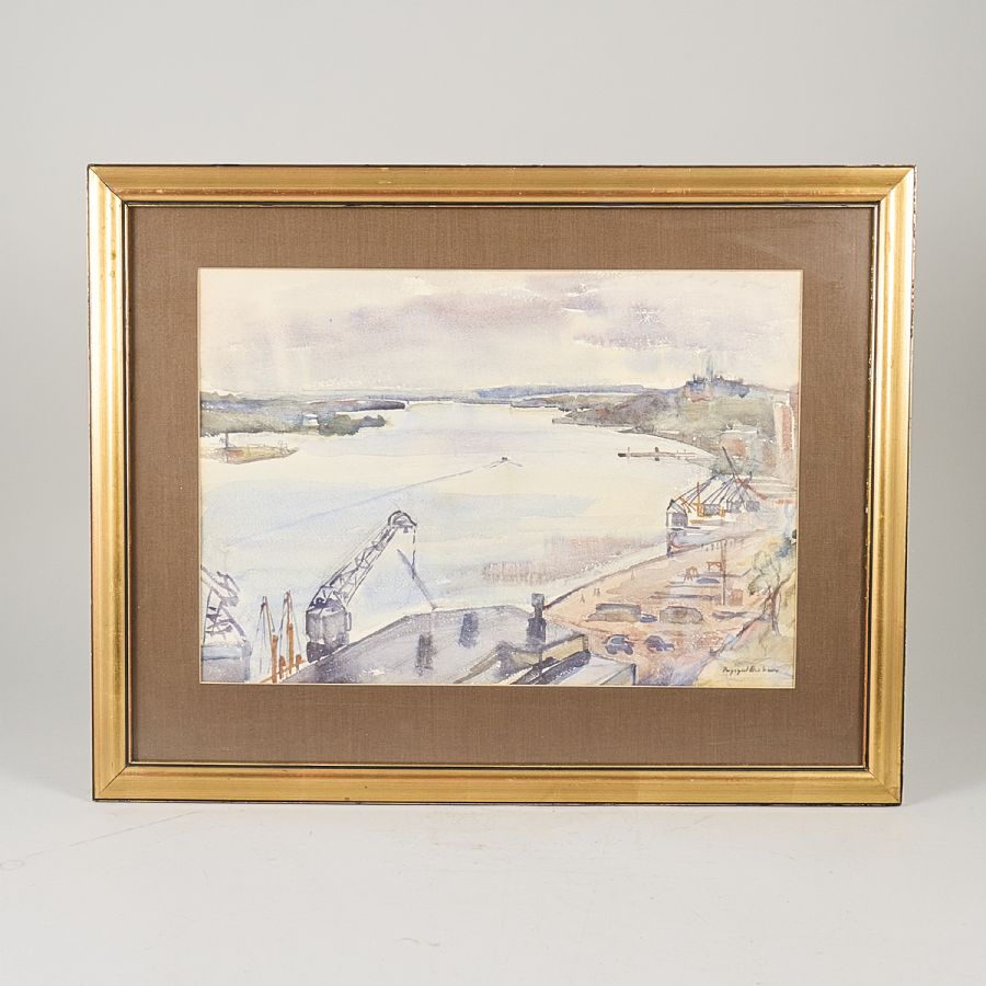 Ingegerd Beskow (1887-1978), inlopp till Stadsgårskajen i Stockholm. Akvarell, bildmått: 34x48 cm, yttermått inklusive ram: 52x66 cm. Signerad