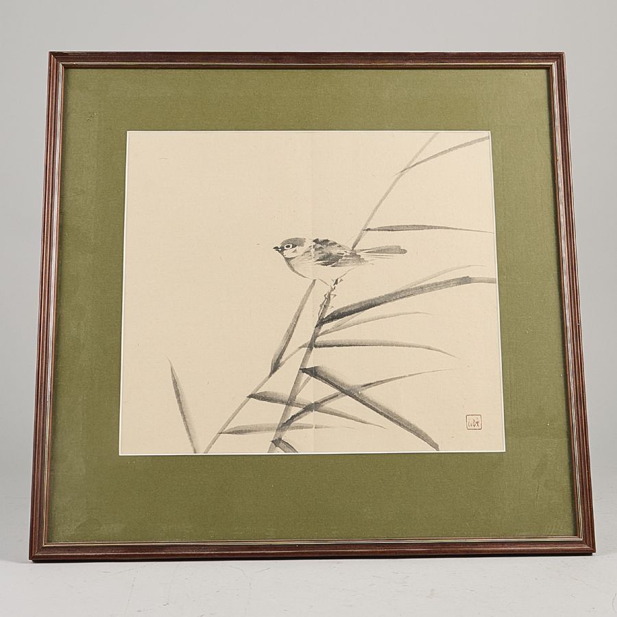 Japan, Fågel, stämpelsignerad. Akvarell, bildmått: 28x31 cm, yttermått inklusive ram: 43x45 cm