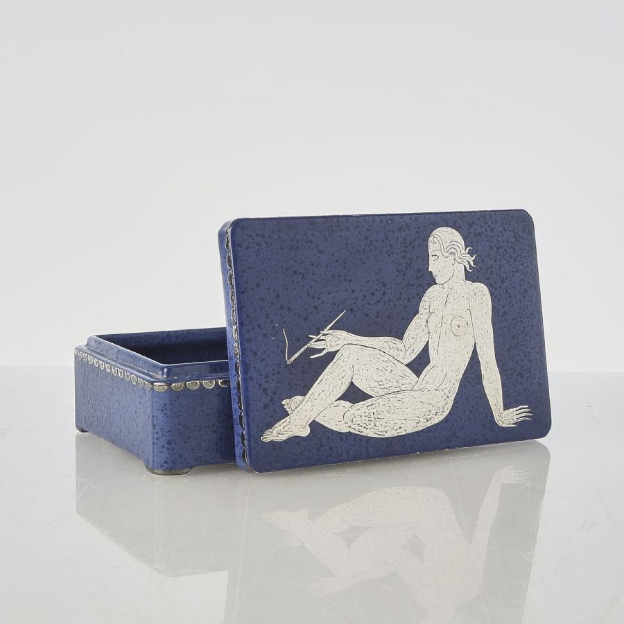 Ask med lock, Argenta, Gustavsberg. Stengods, blå glasyr med målad silverdekor med kvinna. Silverstämpel. Längd: 14 cm. Djup: 9 cm. Höjd: 4,5 cm