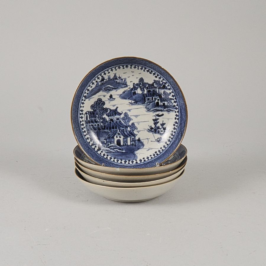 5 st, Kina, blått porslin. Diameter: 16 cm, skador