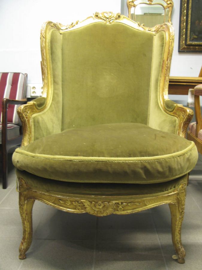 Liknande föremål: bergere bergère dunplymå fläckigt tyg fåtölj förgylld förgyllning guldfärgad gyllene karmstol sekelskifte sent 1800-tal stol stolar
