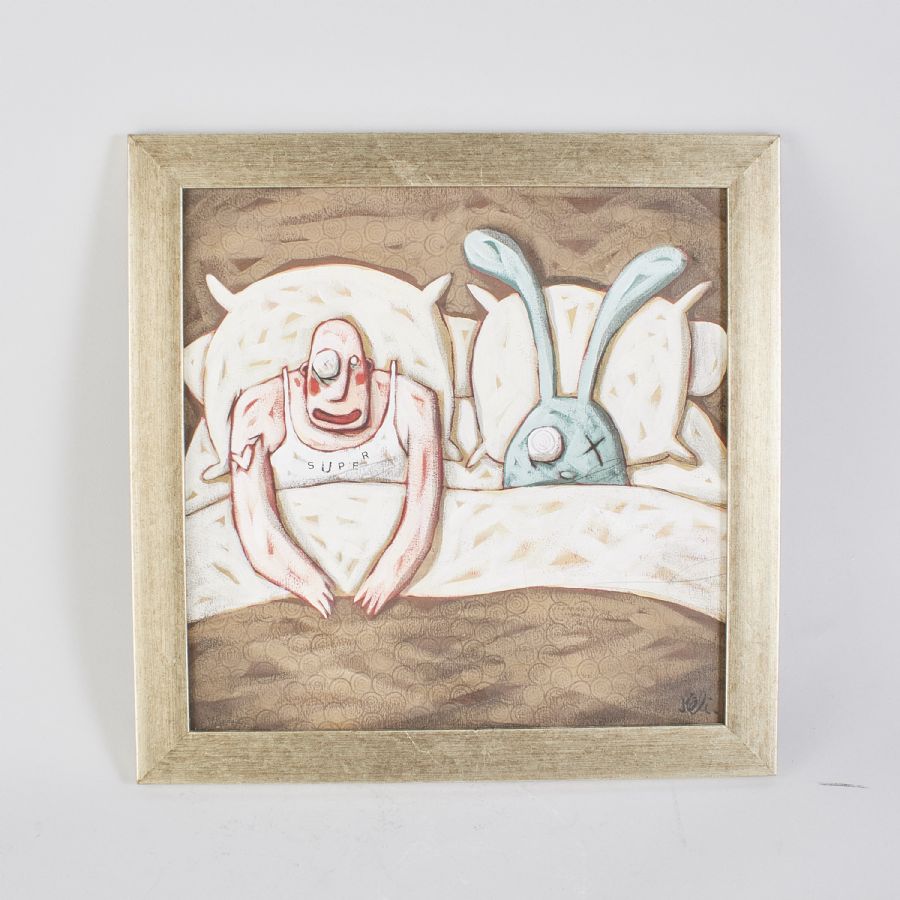 "Super". Signerad. Blandteknik på pannå, 29x29 cm, yttermått inklusive ram: 35x35 cm