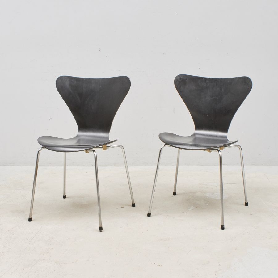 Stolar, Ett par, Sjuan, Fritz Hansen, Danmark. Skiktlimmat trä, stålunderrede med kromade ben, med extra knoppar