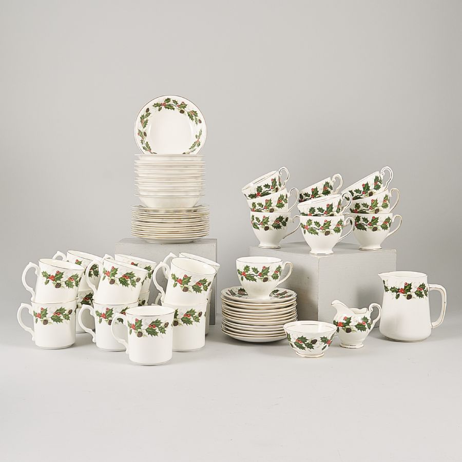 50 delar ca, Royal Grafton samt Royal Tuscan, "Noel", 13 kaffemuggar, 6+ 6 kaffekoppar, 11 djupa skålar, 14 assietter, kanna, mjölkkanna, sockerskål, 2 extra kaffefat. Höjd: 5-12 cm