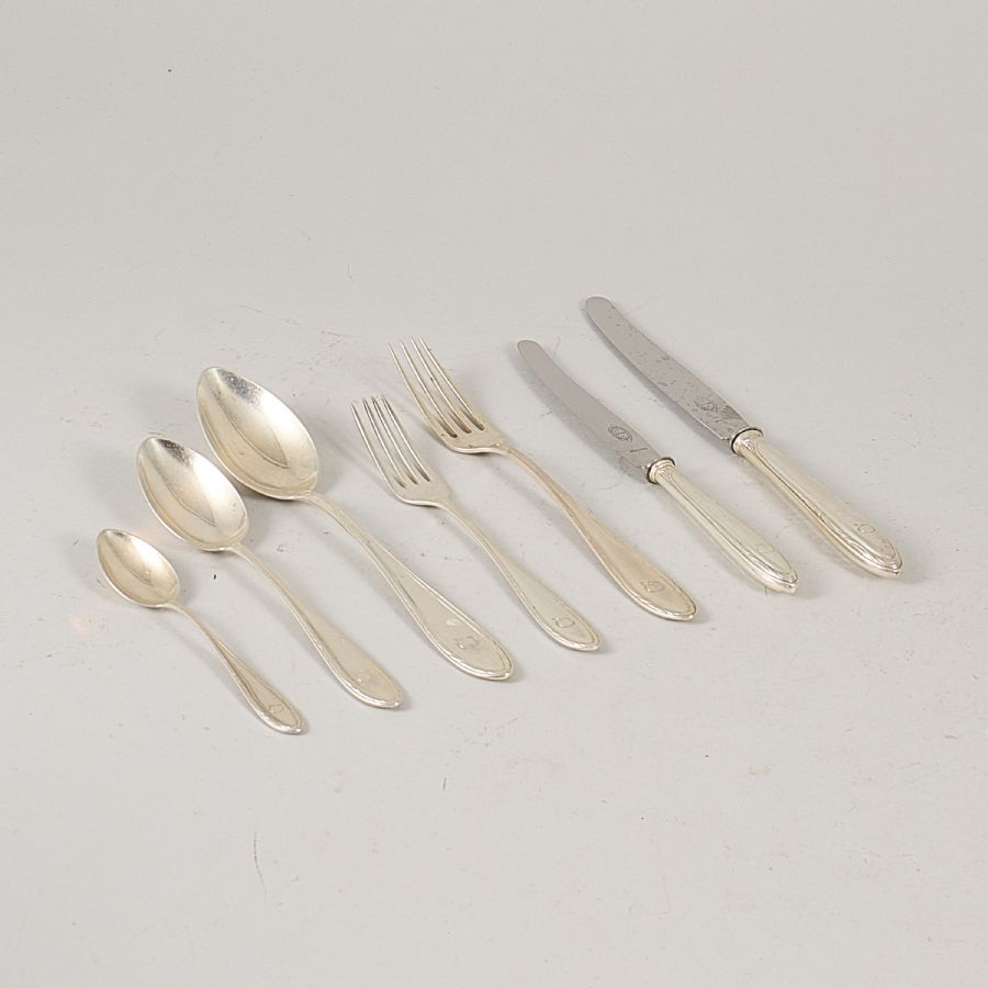 83 delar, silver. Längd: 13-25,5, Vikt: 4000g brutto, varav knivar 1400g ca