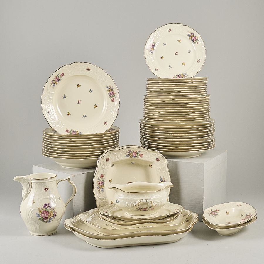 57 delar, Rosenthal, "Sanssouci", 12 mattallrikar, 12 djupa tallrikar, 12 förrättstallrikar, 10 eftrerättstallrikar, 7 serveringsfat, 2 serveringsskålar, 1 såssnipa, 1 kanna