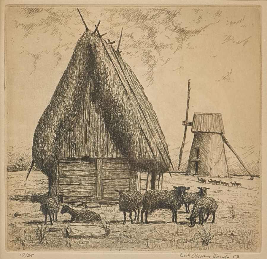 Etsning, Erik Olsson Sanda (1919-2006), 18/25, 1957, motivet: 16x17