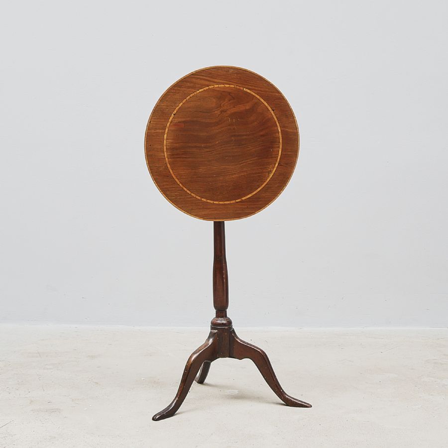 omkring 1800, på pelarfot, intarsia. Diameter: 44 cm, höjd: 71 cm