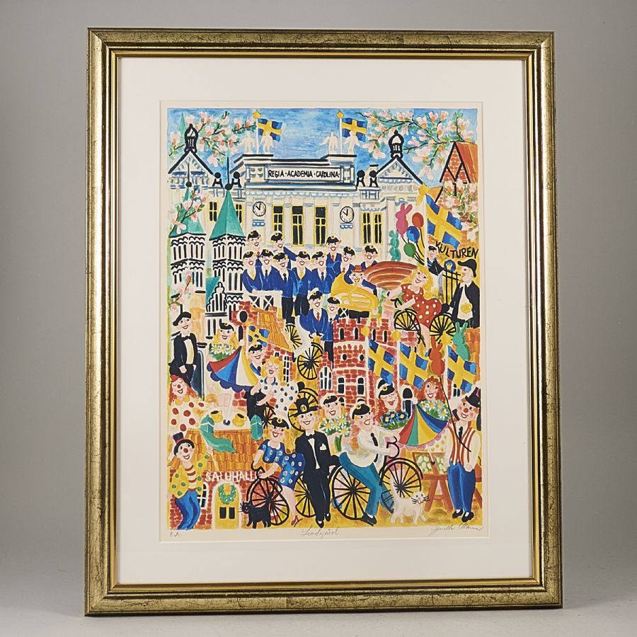Signerad, numrerad EA, Lundagård. Färglitografi, bildmått: 55x42 cm, yttermått inklusive ram: 77x63 cm