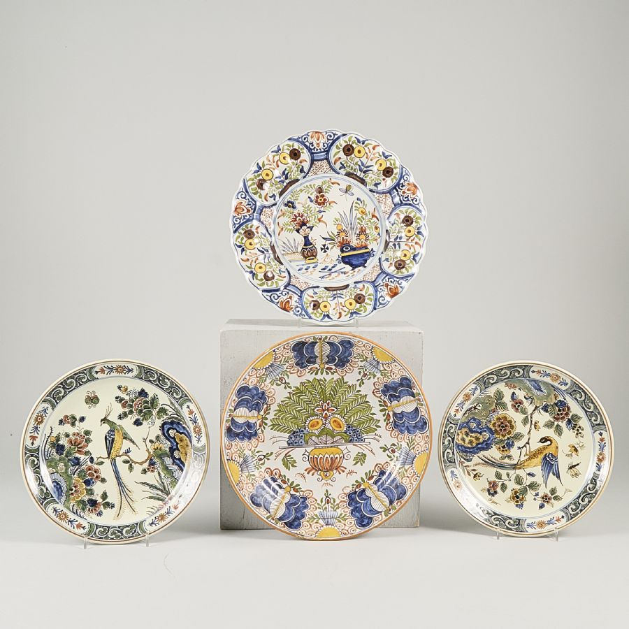 3 st, varav 2 st Delft, fajans, polykrom dekor av blommor och fåglar. Diameter: 23-28 cm
