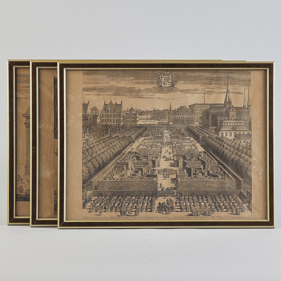 3 st, Ur Suecia Antiqua et Hodierna, bland annat kungsträdgården, yttermått inklusive ram: 32x42 cm. Ej signerad