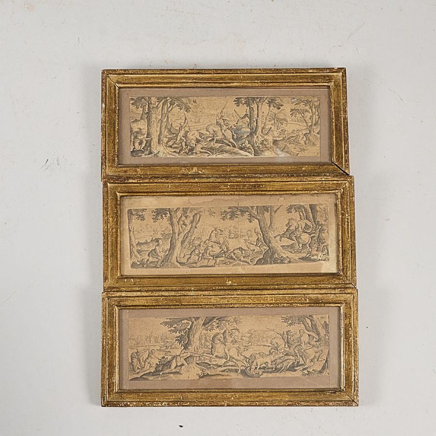 3 st, modell äldre, Jaktmotiv. Bildmått: 7x21 cm, yttermått inklusive ram: 13x27 cm, slitage, skador