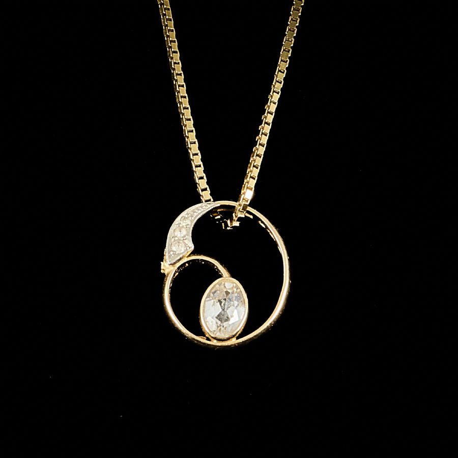 18k guld. Med stenar, Kedja i doublè. Bruttovikt: 5,9 g. Kedjan. Längd: 40 cm