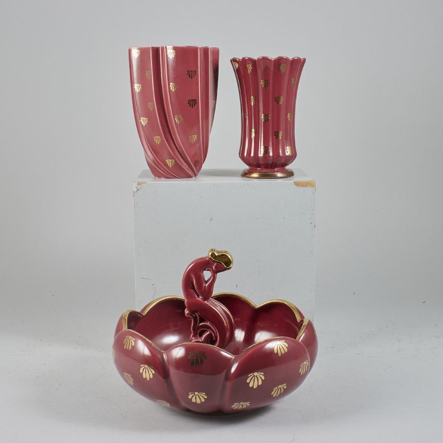 + vaser, 3 delar, Arthur Percy och Eugen Trost, Gefle, "Röd Rubin", skål, diameter: 27 cm. Höjd: 20 cm, vaser. Diameter: 12-15. Höjd: 18-20 cm