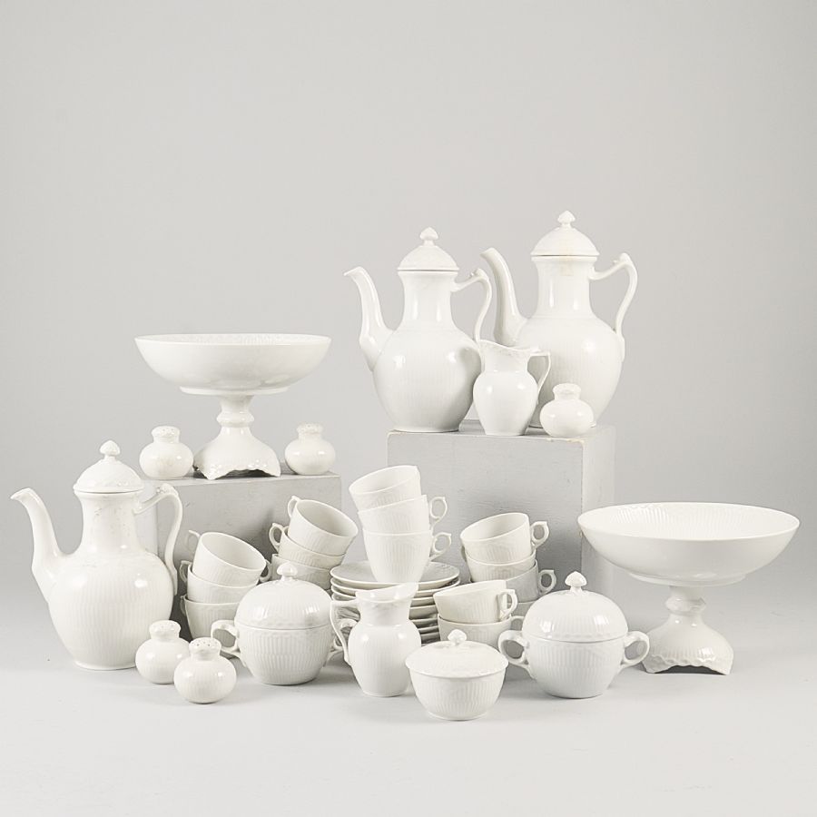 31 delar, Royal Copenhagen, musselmalet, helvit halvblond, 3 kaffekannor, 9 koppar med fat, 7 koppar, 2 gräddkannor, 2 skål, på fot, 3 sockerskål, 5 salt/pepparströare. Diameter: 7- 12 cm. Höjd: 5-25 cm