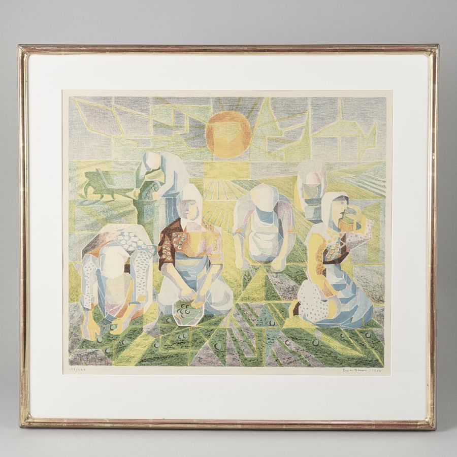 Erik Olson, potatisplockarna. Signerad, numrerad 128/260, daterad 1950. Färglitografi, bildmått: 46x55 cm, yttermått inklusive ram: 67x73