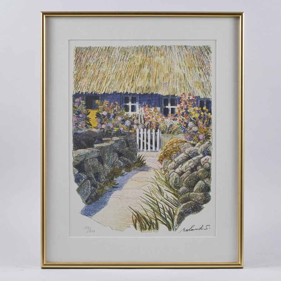 Signerad, numrerad 159/250 "stuga med grind". Färglitografi, bildmått: 48x35 cm, yttermått inklusive ram: 65x51 cm