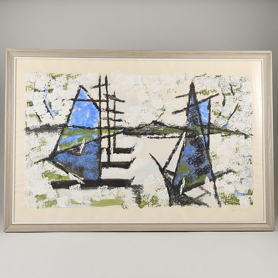 Oidentifierad konstnär. Signerad, numrerad EA, daterad 1962. Färglitografi, bildmått: 52x87 cm, yttermått inklusive ram: 69x102 cm