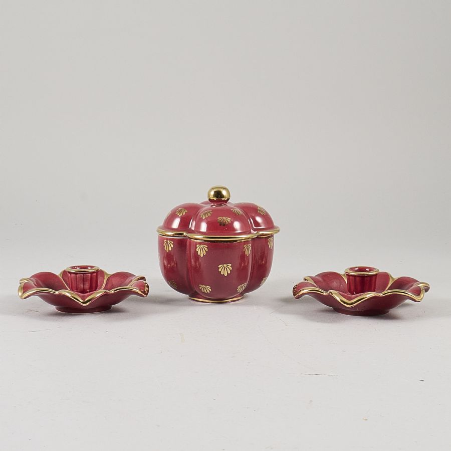 CANDLESTICKS, + skål, 3 delar, Arthur Percy (1886-1976), Gefle, Sverige. "Röd Rubin". Diameter: 13,5 cm, höjd: 12 cm
