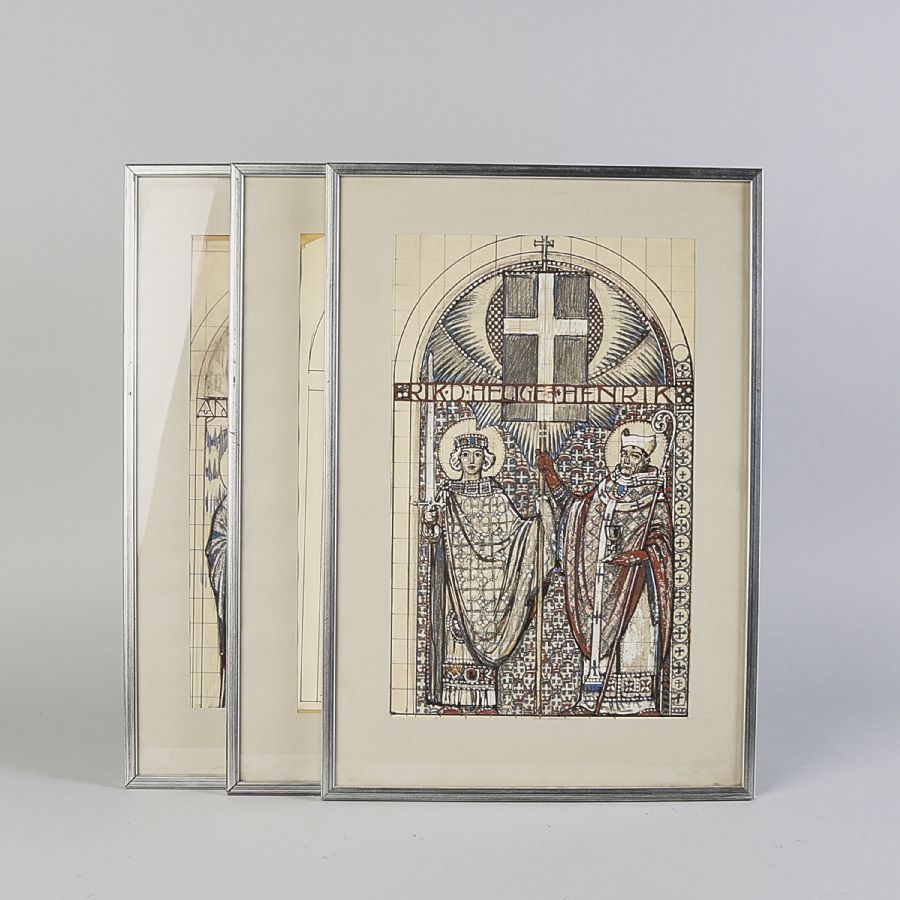 3 st, (tillskrivna), ej signerade, Förlagor till väggmålningar i Uppenbarelsekyrkans kor Saltsjöbaden. Blandteknik, bildmått: 39x25 cm, yttermått inklusive ram: 52x36 cm