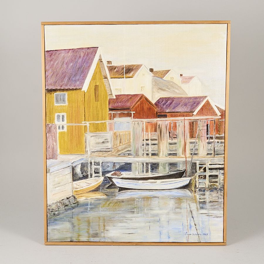 Å Von Scheele. Signerad, daterad 1987, fiskeläge. Olja på duk, yttermått inklusive ram: 63x52 cm