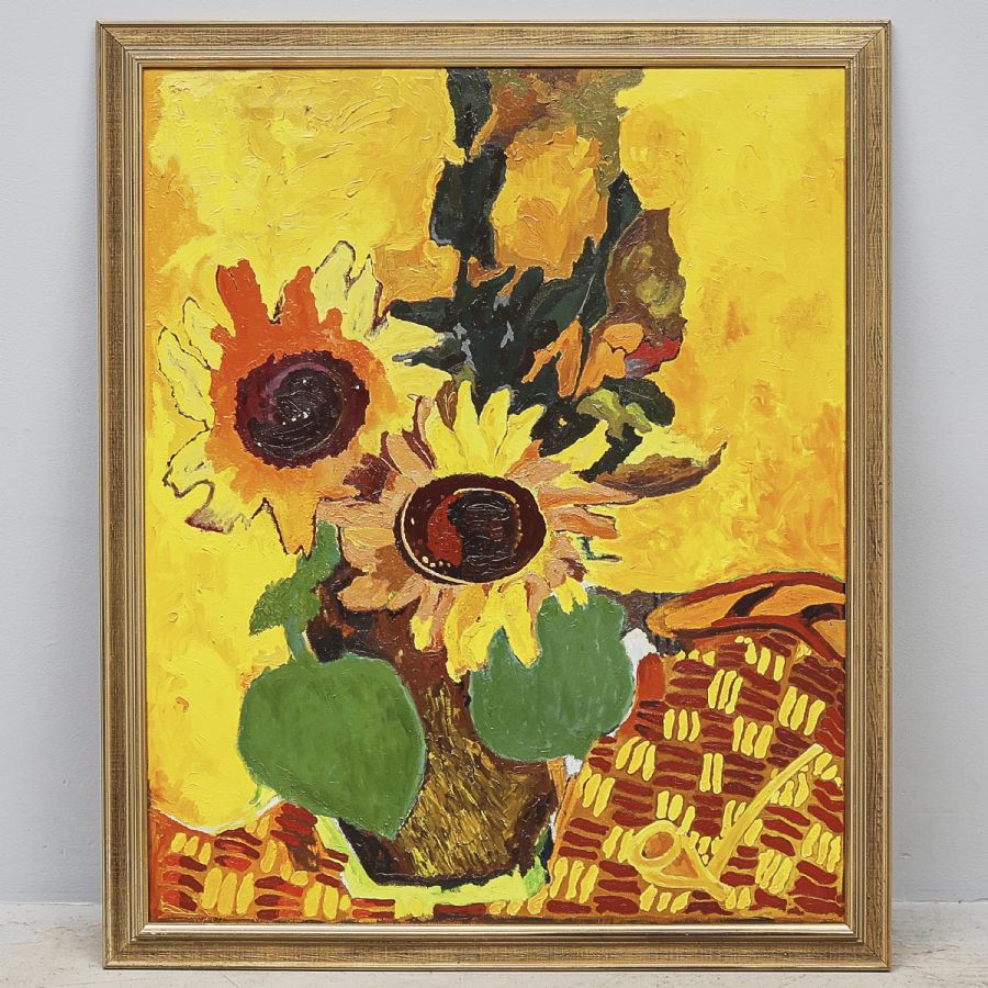 Bertil Högberg. Signerad a Tergo, solros. Olja på duk, bildmått: 116x95 cm, yttermått inklusive ram: 128x106 cm