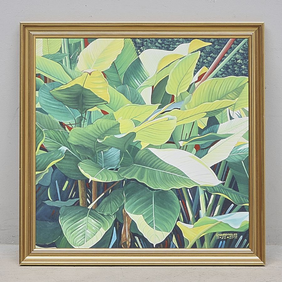 Chamreynales. Signerad, daterad 2022, blad. Olja på pannå, 74x74 cm, yttermått inklusive ram: 85x85