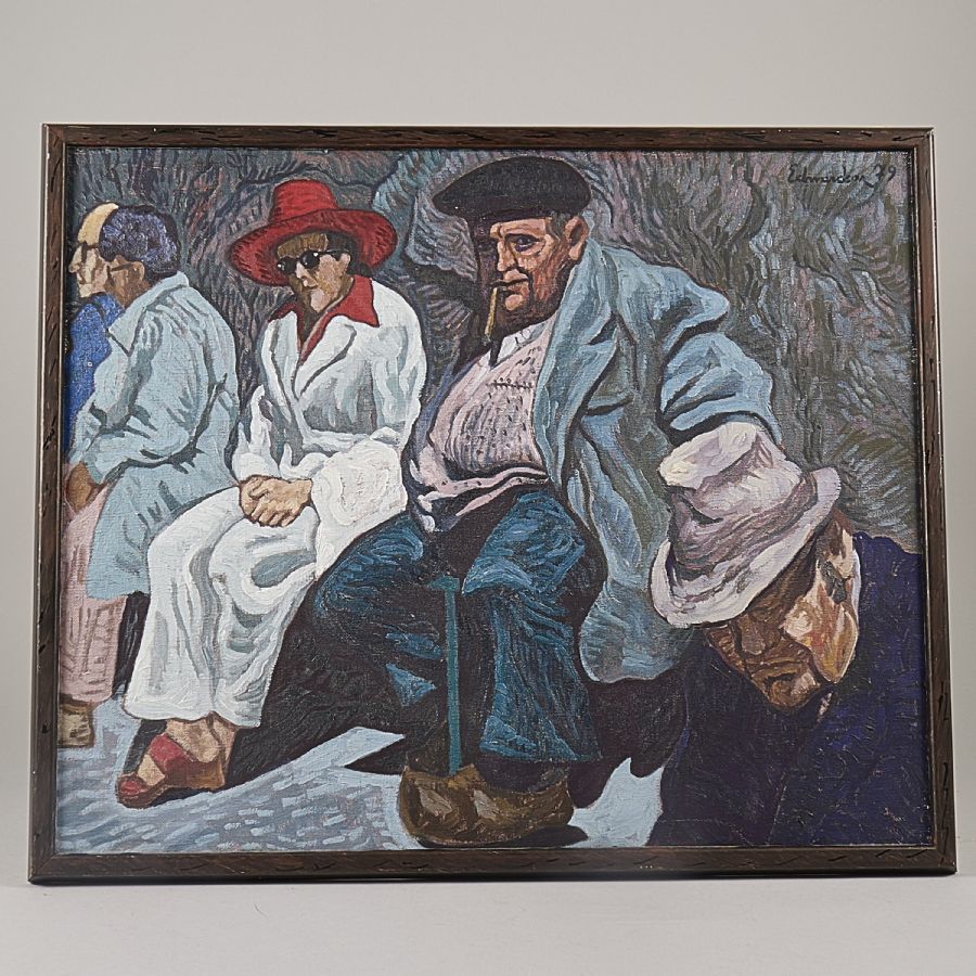 Oljemålning, Signerad, daterad -79, Människor i park. Olja på duk, 49x60 cm, yttermått inklusive ram: 53x64 cm