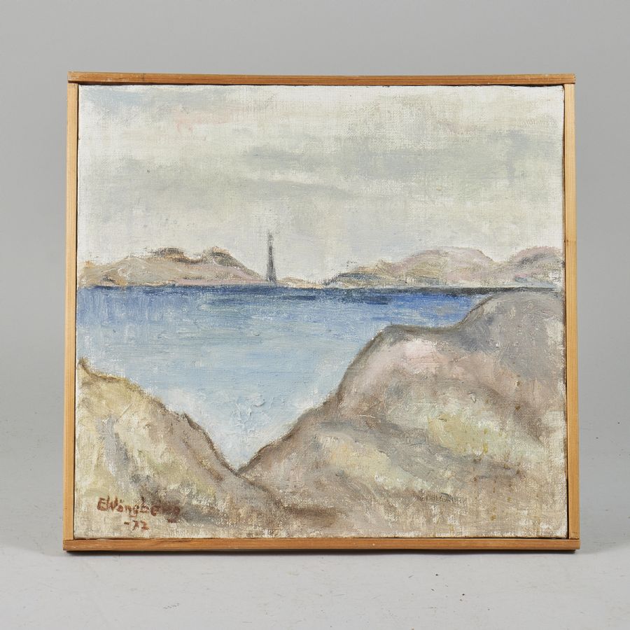 Oljemålning, "Pater Noster på Tjörn". Signerad, daterad 1977. Olja på duk, 36x39 cm, yttermått inklusive ram: 38x41 cm