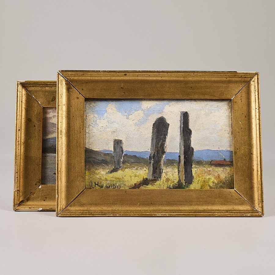 Oljemålningar, 2 st, "Halland & Lappland". Signerade. Olja på pannå, yttermått inklusive ram: 20x28 cm