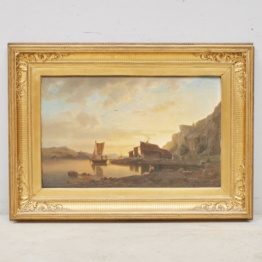 19th century, Fishing Hamlet. Oil on canvas, 46x74 cm, outer dimensions including frame: 73x100, crazings, damages on frame.