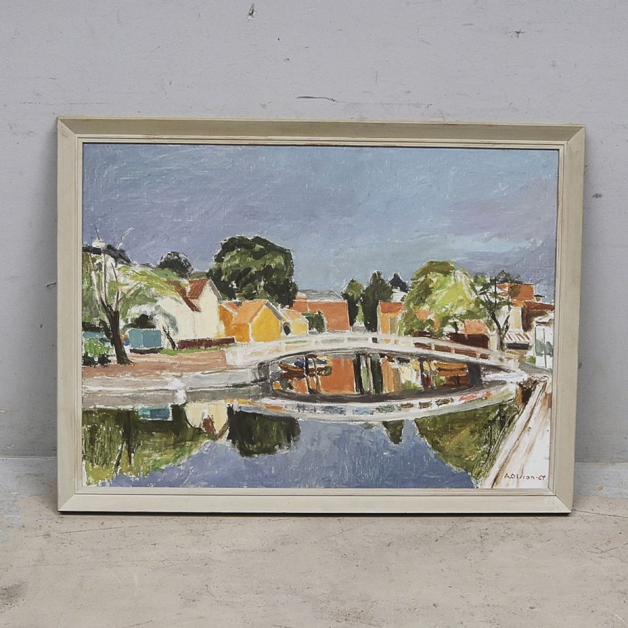 A. Olsson. Signerad, daterad 67, Norrtälje, "socitetsbron" pannå, 66x90 cm, yttermått inklusive ram: 76x100