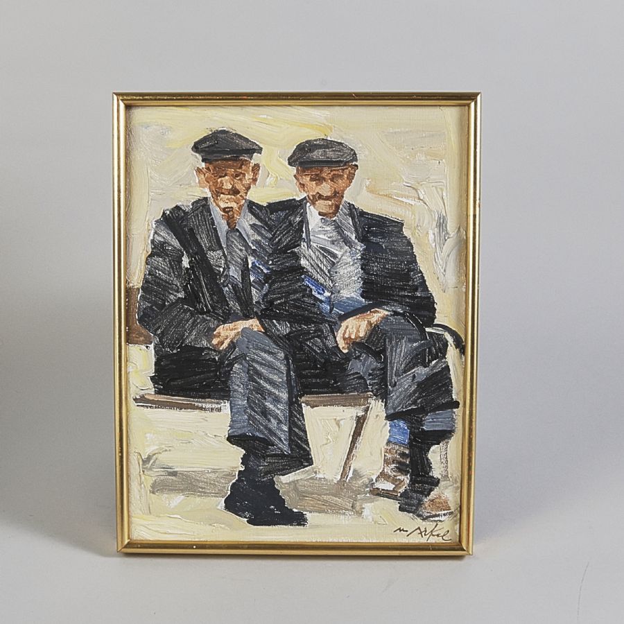 Oljemålning, Gubbar på bänk. Signerad. Olja på duk, 34x26 cm, yttermått inklusive ram: 37x29